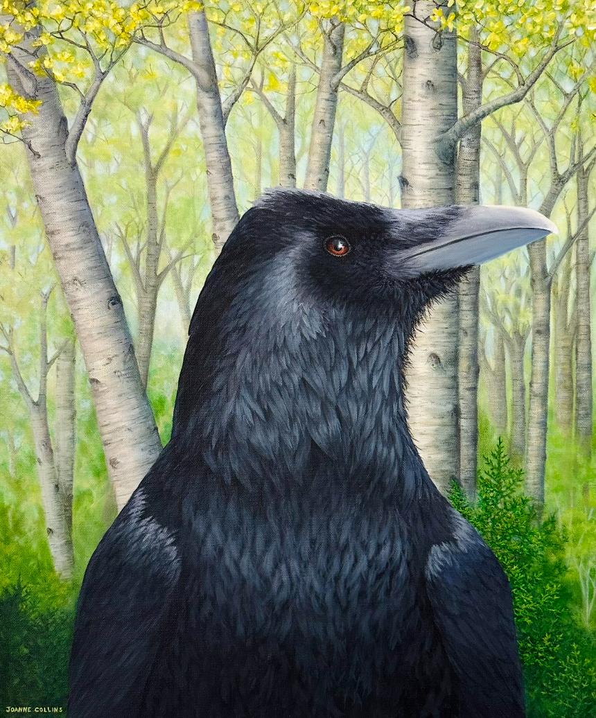 I am continuing to explore a romantic surrealism style in this painting that captures a magical moment I shared with this beautiful raven. Hiking in Algonquin Park, I was resting by the shore of Peck Lake when this fellow landed within a few inches of me. He generously allowed me to take his picture, and we had a nice talk before he flew away.